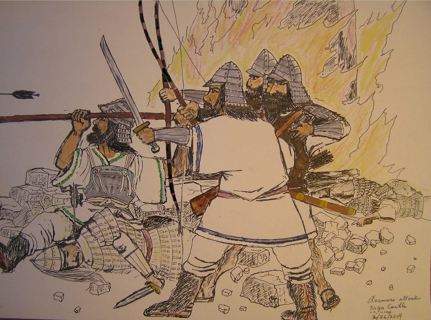 Azamaro's forces strike terror in the Sendai plain as Taga Castle falls in this illustration. This marks the sixth year of the so-called Thirty Eight Years War. The Emishi rebellion started with Ukutsuhau and Azamaro and a number of important forts fell to them as they attacked and plundered their way south. Momunohu castle was burned in 774. Taga castle, the administrative headquarters of the imperial government in Michinoku was then attacked and similarly put to the torch in 780. Before the battle of Subuse one could argue that Azamaro's attacks penetrated further south and struck greater fear upon the Japanese than any Emishi had done since. (1)