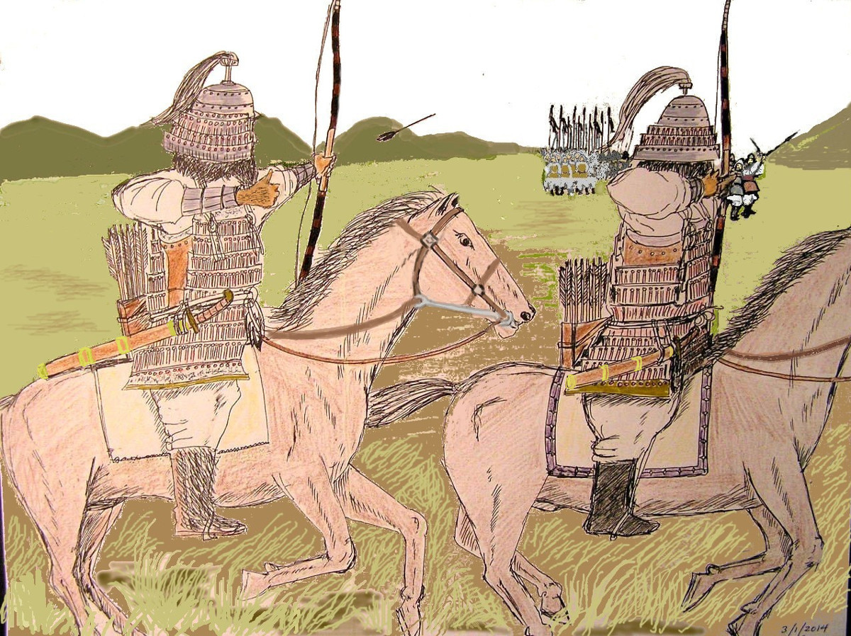 Emishi battle line of the late eighth century consisted of mounted archers that were used as a quick strike force that proved to be too much for the Japanese army to catch and defeat. Here Azamaro's forces are shown harrying the Japanese army as they raid their territory. They are shown wearing keiko armor and are armed principally with the bow and sword. He had access to the latest armor probably more as a result of his plundering of Taga Castle than as a fairly high ranking officer in the Japanese army before his defection. It was only after the Japanese gentry started training their sons in horse archery, and the army recruited them to fight the Emishi did the war turn in their favor. For the Emishi archery was second nature as they were hunters. From the trained horseman came the samurai, so the rise of the samurai and their style of warfare was a direct result of the Emishi wars. Azamaro, leader of the Korehari Emishi and the Isawa Emishi were the two clans that fought the Japanese throughout the Thirty-Eight Year War.