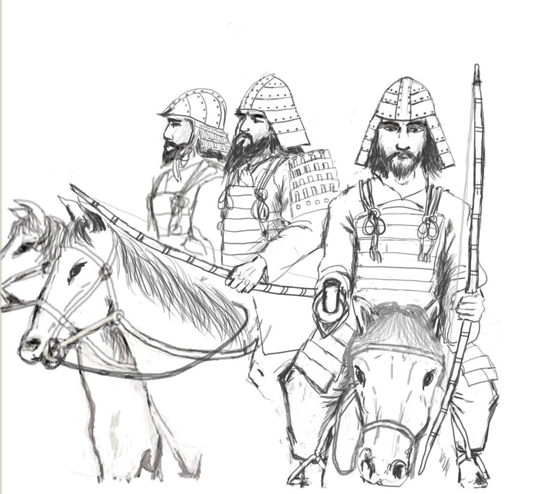 Mounted archers formed the backbone of the Emishi army. Here the harness on the horse in the middle is shown, and is taken from the kofun haniwa or clay figurines that show the horse equipment in detail. It shows a metal horse bit that connects the headgear of leather which goes up and around the top of the horses's head with a strap above the mouth anchoring the harness, and the bridle is then connected to the front of this metal piece that serves as a bit, and the back connects to the bottom strap connected to the head strap. Haniwa figurines rarely show the bridle. Of course we don't have pictures of Emishi horses but extrapolating from haniwa figurines is most likely an accurate portrayal of the way horses were harnessed, or at least very close to the Emishi practice since the figurines are from kofun graves that were recovered in frontier areas in eastern Japan and southern Tohoku before their period of dominance. In the frontier areas where kofun culture had a influence on local Emishi culture they most likely adopted this practice, and spread further north through cultural diffusion as it enabled the horse rider to control their horses more effectively. The stirrup was also key in mounted warfare as it gave greater control to the rider to free both hands to manipulate the bow, their principal weapon.