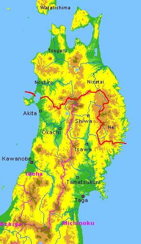 Thus the strong Isawa Emishi had been defeated and Japanese territory had expanded much further north.  Many of Tamuramaro’s measures succeeded.  Tamuramaro himself returned to Michinoku in Enryaku 22 (802), and built Shiwa Castle.  Perhaps, at about the same time, Okachi Castle was moved further north.  Coastal horse stations in Michinoku were abandoned perhaps together with Momunohu Castle.  Instead, a new line of forts were established towards Isawa and Shiwa.  Provisions for the next expedition were sent to Fort Nakayama (location currently unknown).
