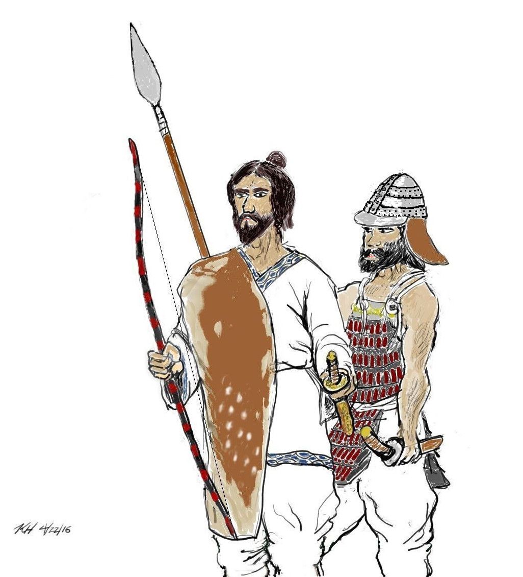 The Emishi general Aterui is shown here with an attendant. I interpret him as fully within the tradition of his people as a great Jomon leader who forged alliances with different Emishi groups in the Hitakami basin.  As such he wears the acroutrements of what is the pre-cursor to the Satsumon culture complete with clothing that would later become characteristic of Ainu design, the Emishi deerskin and the elaborately designed wara-bite sword scabbard and typical Jomon designed laquered bow.  Though his clothes are influenced by Yayoi culture in material this picture shows someone who is culturally very different from Japan's Yayoi.  He wears his hair in the typical Jomon fashion that also influenced later samurai hairstyle.  He also has dark brunette hair not uncommon among the Ainu and their ancestors.
