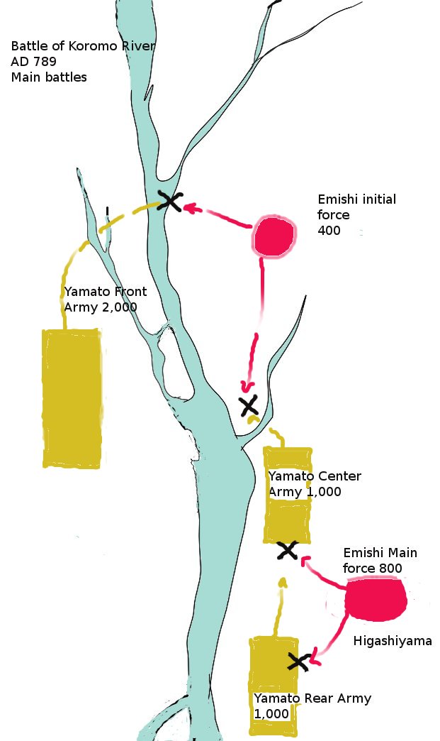 To select a day to appoint the general is according to the Emperor's word. To go on the expedition is the mission of the general. I hear, that it happens in many situations, that lower commanders do not observe the military command. The reason is that they underestimate the law. If the Vice General commits a crime, you should arrest him and report it to me. [You can] enforce the death penalty which involve military directors (gungen) or lesser officers [if they commit a crime]. Security of Bando rests on this action. You must make every effort [to enforce this directive].Japanese army began its mobilization the following Spring. On March 28, the army camped beside the Koromo River (Koromogawa), perhaps inside the Isawa boundary around the neck of the Kitakami Basin. The army crossed the river and built three camps. The camps were placed like a triangle (literally 'feet of Kanae'). Many insist that this means three units camped across the river from each other, but I think it is not necessarily a correct interpretation. To cut off mutual support between units is irrational. The army remained inactive in this position for a few months.