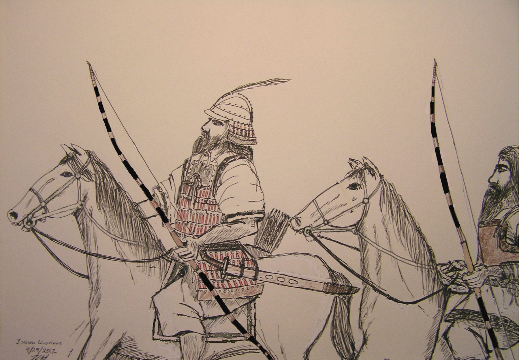 Isawa warriors ride to battle the Japanese forces. The swift horsemen of the Isawa could gather and attack much faster than the forces of the Japanese could defend. This leader on the left wears keiko that was given to him through his service to the Japanese government. The helmet is modeled on an actual one recovered from an Emishi burial site near present day Morioka. He has a large warabite-to sword. The warrior to the right is not armored except for a leather tanko. Many Emishi did not have metal armor. However, much of the armor was also taken from Japanese captives and fallen soldiers during battle. The bows were lacquered with alternating black and reddish bands to both waterproof and strengthen, a technology that was known from the Jomon period. The clothing reflects a pre-Ainu design with simple bands and Epi-Jomon motifs on the borders of the textile. The keiko reflects Ainu armor, virtually unchanged from Nara armor from which it was modeled.