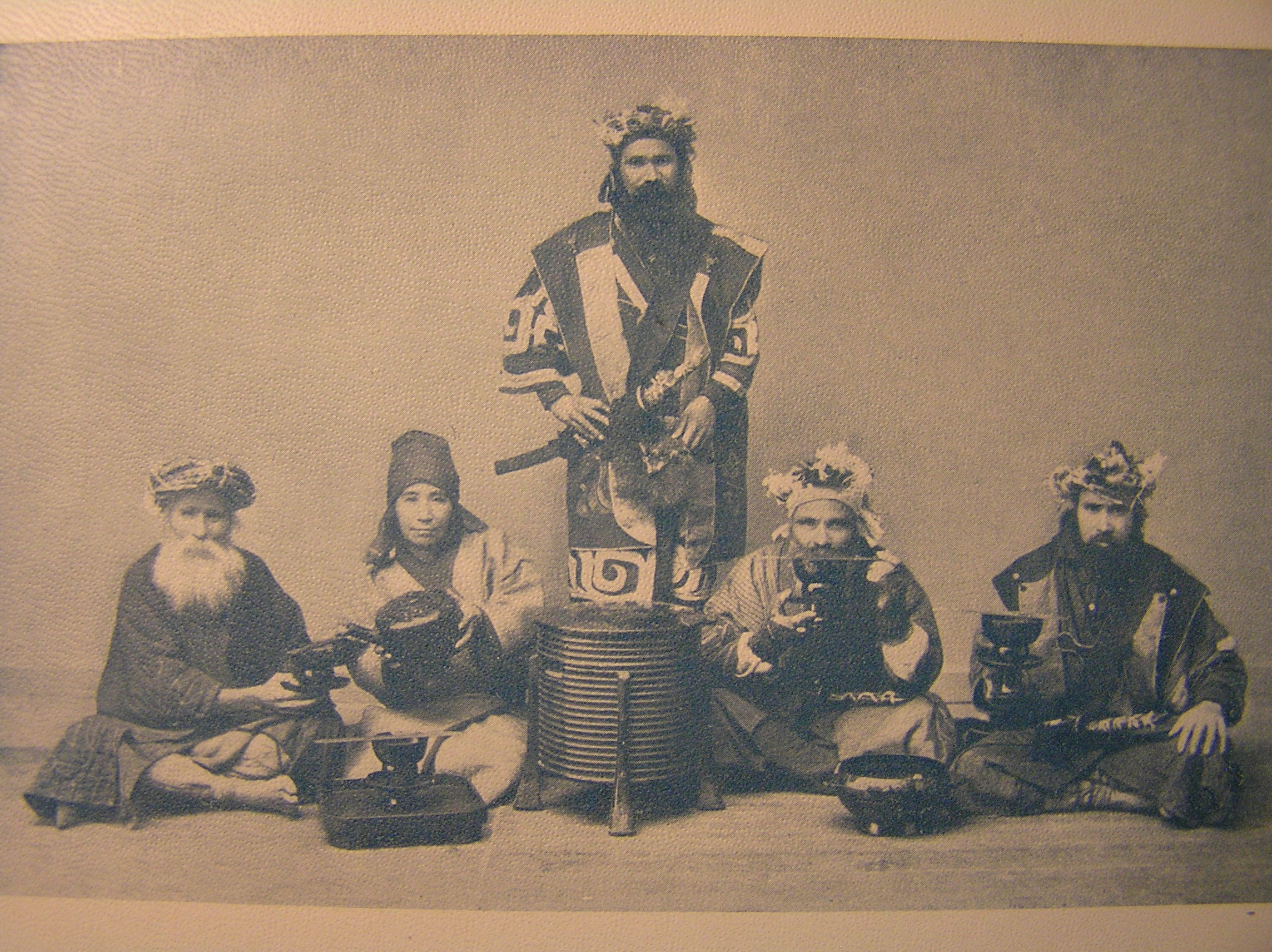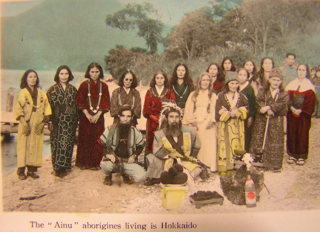 Below is a rare photo of mostly Ainu women and two men in the foreground that is hand-tinted from the 1930's.