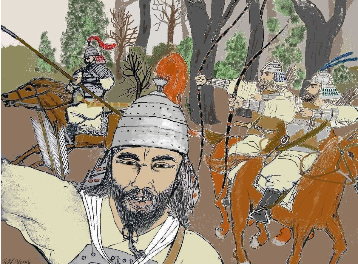 3. Sasama Yoshihiko. Nihon no Bugu Kachiu jiten. (Tokyo: Tsukasa sei-han, 1981). Drawings of ancient armor by the author on this website are for the most part modeled on this work, though any discrepancies of interpretation (as these are applied to the Emishi) are of course my own. The Emishi are depicted with riding boots widespread among continental and Nara (and Heian) cavalry of this time period with wide legged trousers. They probably also wore common footwear made of woven straw which would have been easier to maintain (Destruction of Castles in Michinoku, first illustration). The Illustration was revised (2016.4.26) to reflect current research on their armor, bows and horse equipment. The helmets of a couple Emishi were changed to reflect what they most likely wore during this late eighth century battle. Also small details such as stirrups and horse trappings are now more in line with evidence from kofun depictions and archaeological finds from likely Emishi tombs. I've also for the first time colorized the image and added background for context of this particular episode where the main Emishi army arrived from the Eastern mountain (higashiyama) (located to the right) and pinned the Japanese army against the Hitakami river (see detailed description). Compared to the Emishi horseman depicted on the Destruction of Castles, second illustration (see link above), these warriors had less of the newer armor because they had never been employed as fushu (allied Emishi) troops like Azamaro's men.